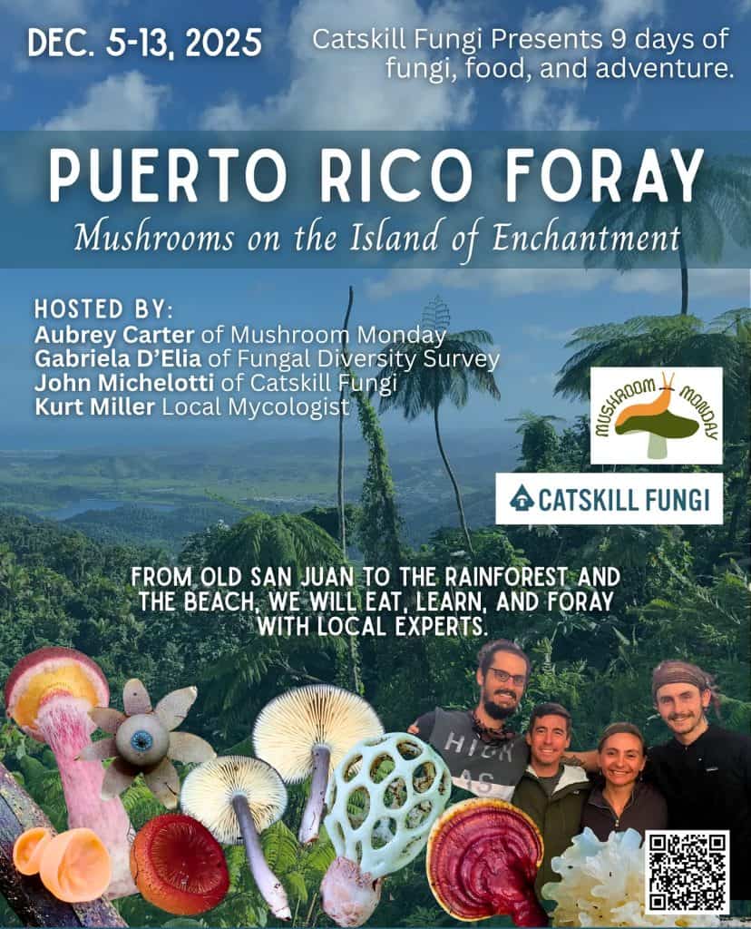 Kurt Miller, expert mycologist of Puerto Rico and community scientist. Kurt has interned with Forest Service mycologist Dr. Jean Lodge and served as a field biologist during the 11th International Mycology Congress in San Juan. He studies tropical fungal ecology, taxonomy, and rare fungal species, particularly those forming mycorrhizae with sea grape (Coccoloba spp.). He administers Fungi of Puerto Rico, leads fungal identification walks across the island, and is a FunDiS Biodiversity Database Identifier specializing in Caribbean fungi.