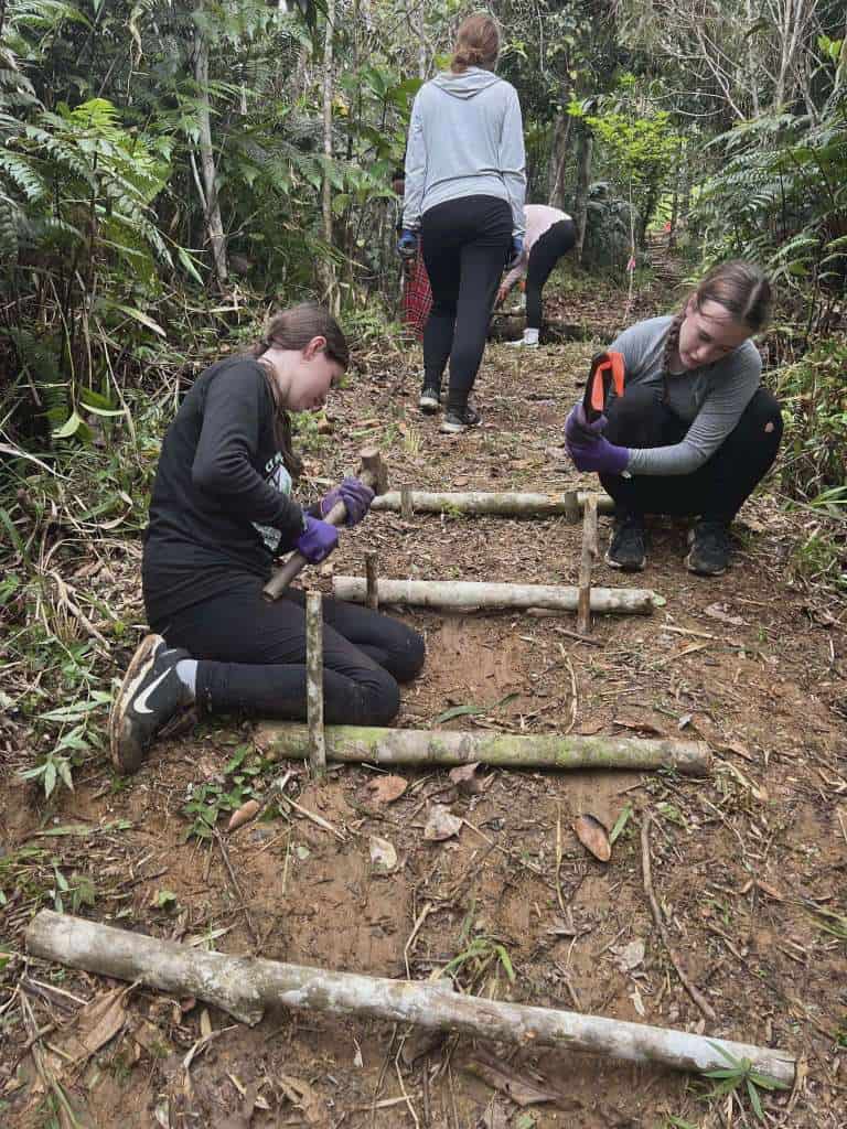 Team Ausubo, led by Jon. On a steeper section, steps were built into the slope. Physical, repetitive, and precise. Each step placed to hold, to last, and to make the trail usable over time.