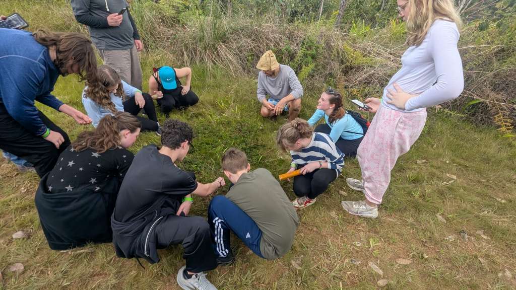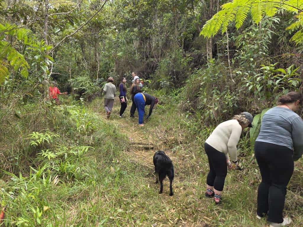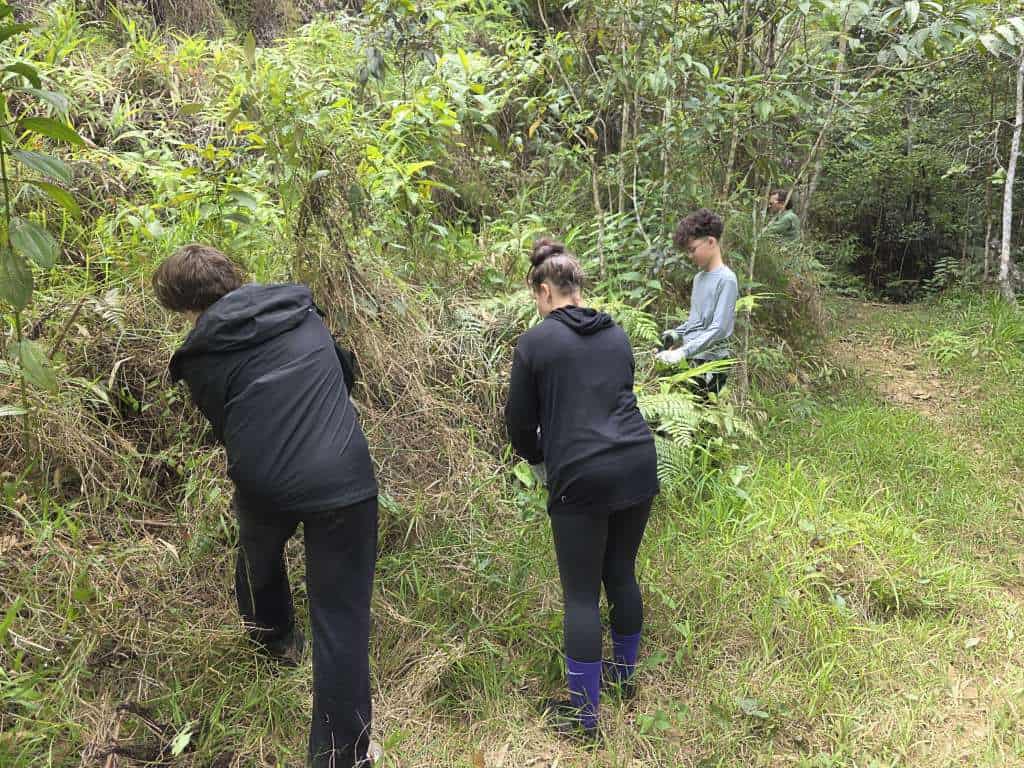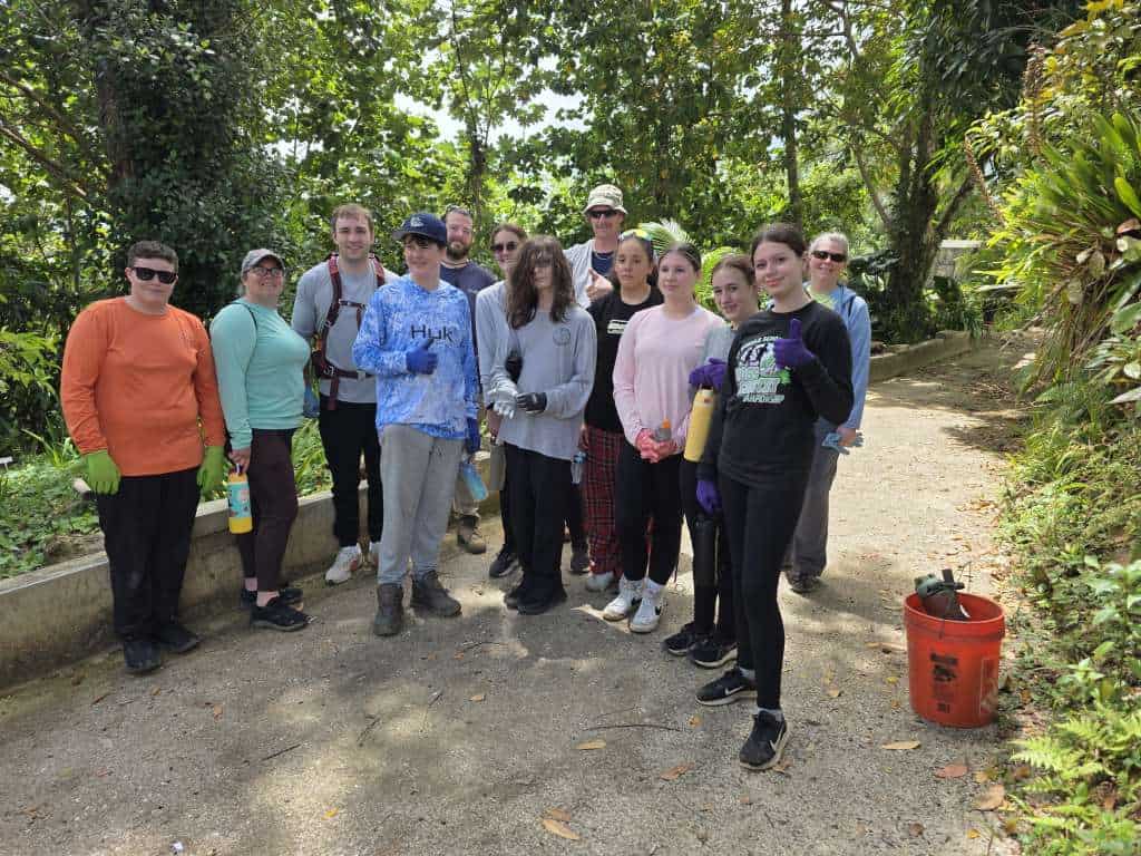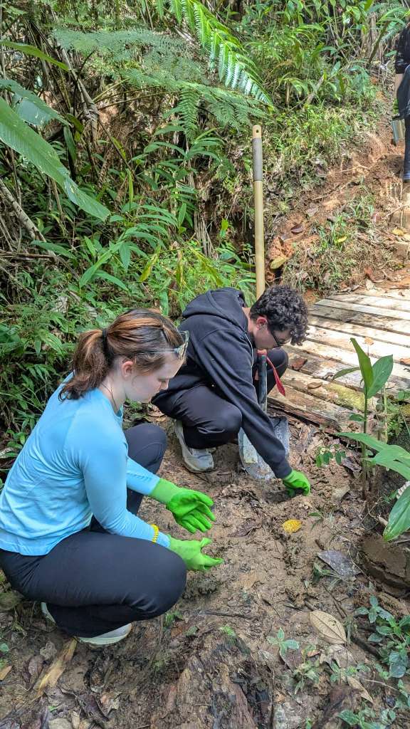 Team Tabonuco, led by Mercury. On the ethnobotanical trail, another group focused on drainage. In the rainforest, water defines everything. If it is not guided, it erodes. If it is managed, it supports the system. Students worked to open channels, move debris, and keep the trail intact.