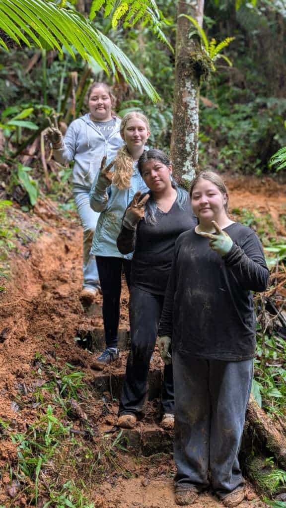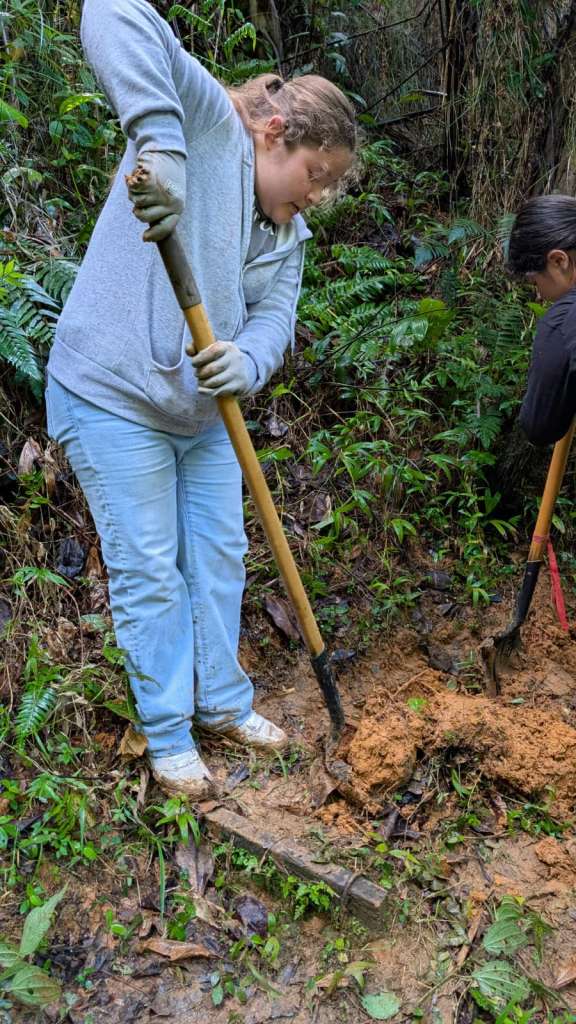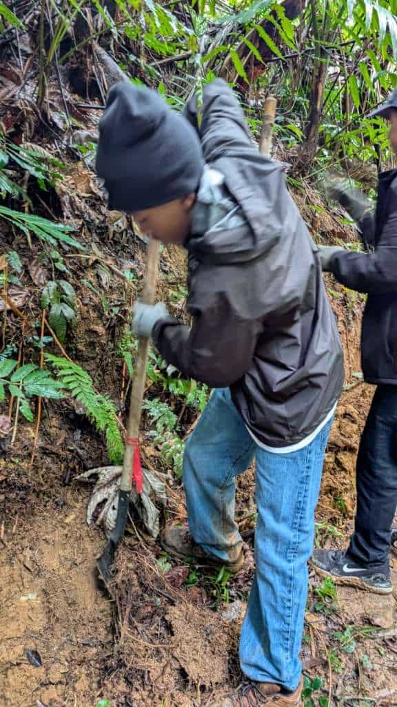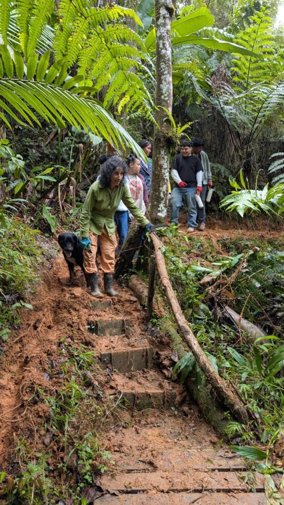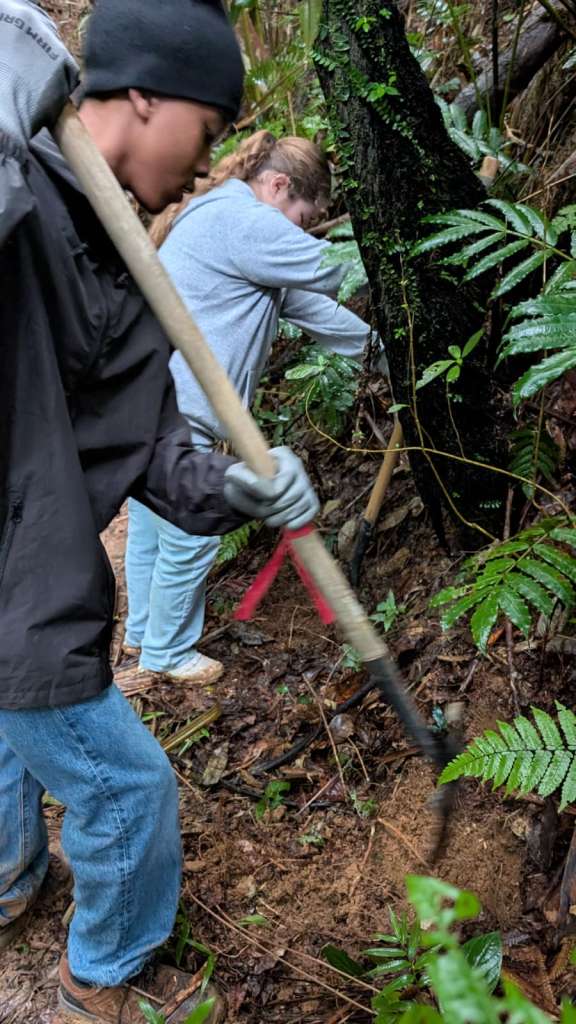 They arrived in a wet stretch of weather and went straight to work. Rain was constant, the ground saturated, and conditions demanding. The focus of the work was the Ethnobotanical Trail. Working alongside crew leaders 3t, Jon, and Mercury, the group took on essential tasks across the trail system. This included cutting back aggressive razor grass (Scleria secans), a perennial scrambling sedge in the Cyperaceae family. Since Hurricane Maria opened the canopy, increased light has driven rapid growth of razor grass and vines, making this ongoing work critical.
