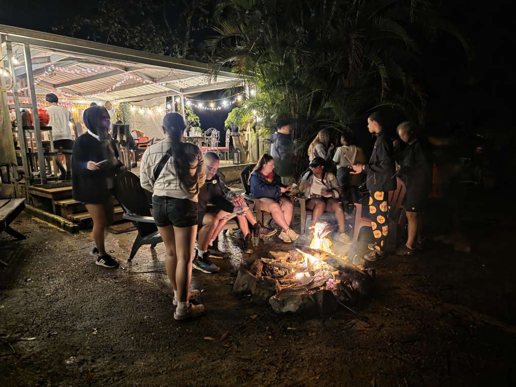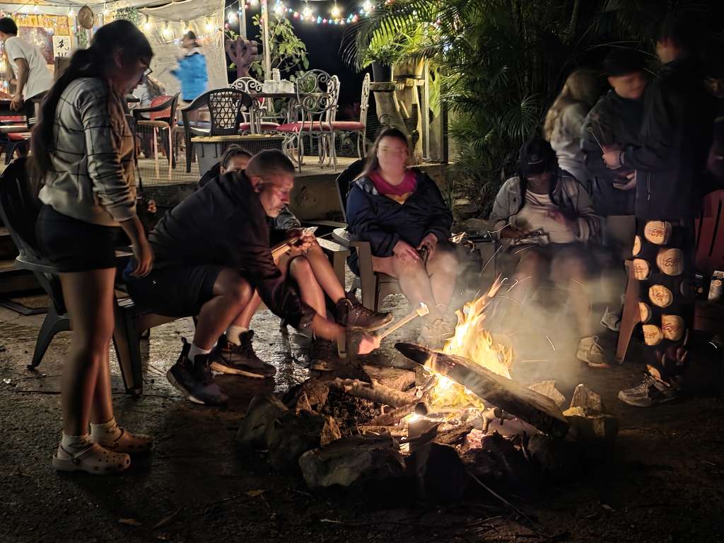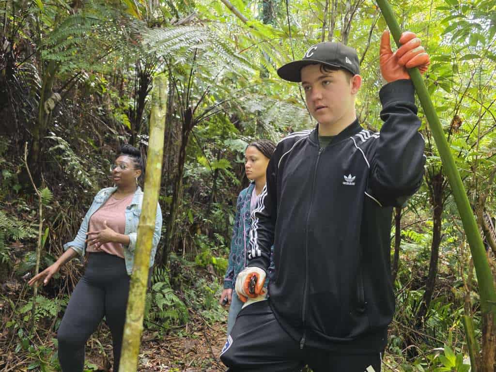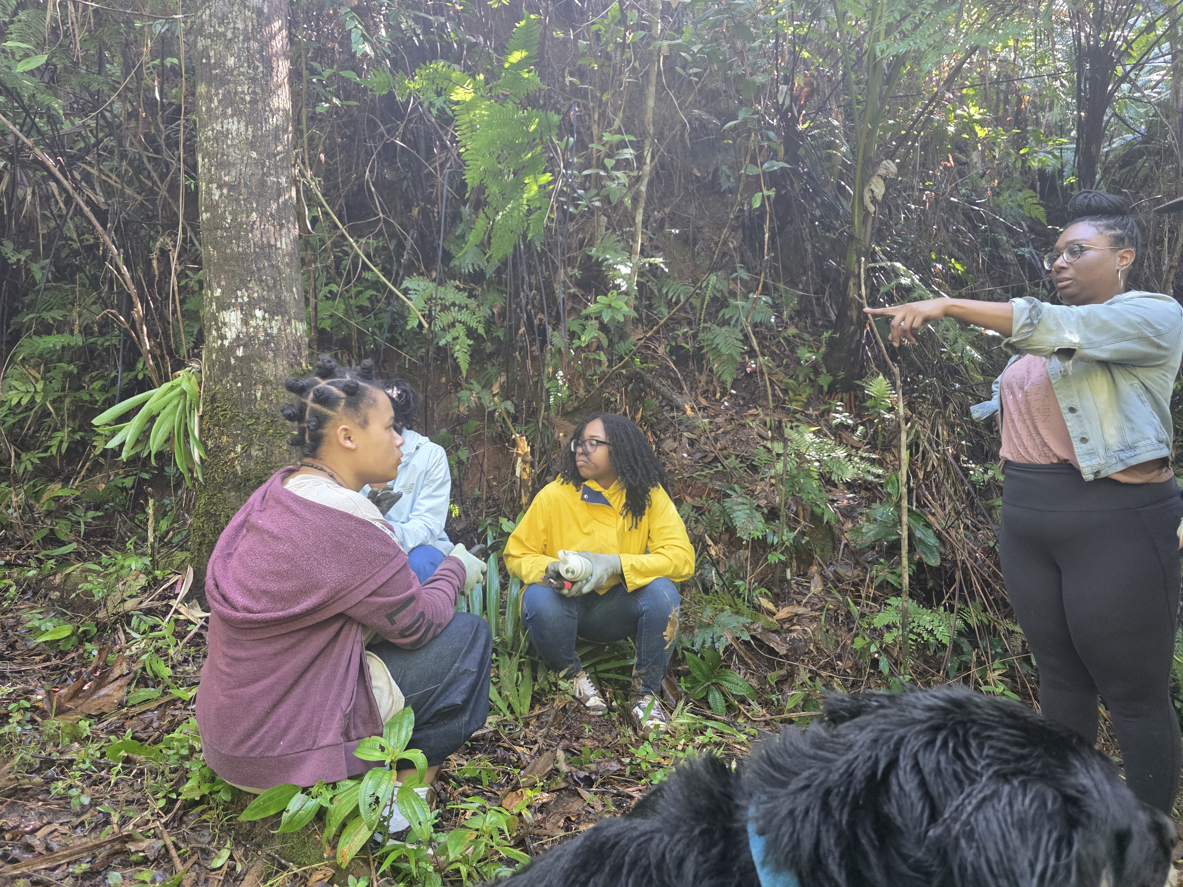 They arrived in a wet stretch of weather and went straight to work. Rain was constant, the ground saturated, and conditions demanding. The focus of the work was the Ethnobotanical Trail. Working alongside crew leaders 3t, Jon, and Mercury, the group took on essential tasks across the trail system. This included cutting back aggressive razor grass (Scleria secans), a perennial scrambling sedge in the Cyperaceae family. Since Hurricane Maria opened the canopy, increased light has driven rapid growth of razor grass and vines, making this ongoing work critical.